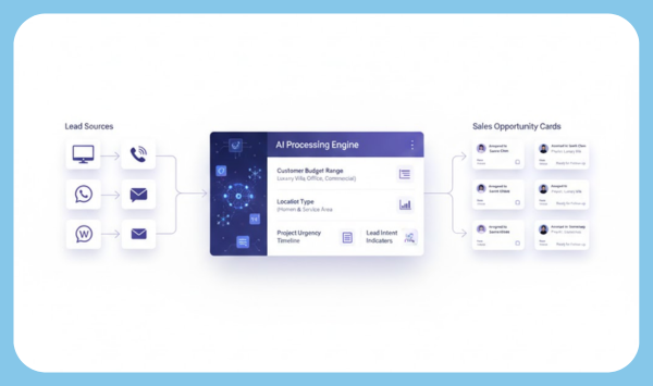 The system processes leads from multiple sources including websites, phone calls, WhatsApp, and emails, converting them into structured and prioritized sales opportunities ready for immediate follow-up.